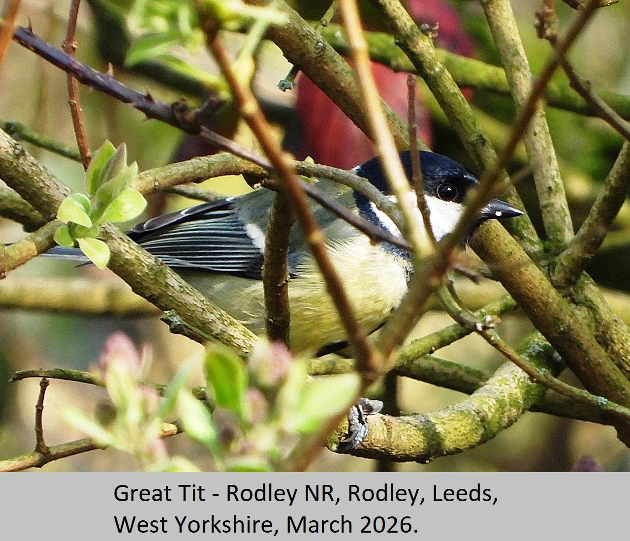 Great Tit: UK Status: Resident and native to the British Isles. Habitat: This can be found in parks, gardens, hedgerows and woodland, in fact any where with nesting cavities and a plentiful food supply. They eat insects and seeds. Breeding: Nests are made in tree hollows, gaps and cavities in walls, or rock faces, and nest boxes. The nests are from dried grasses and other plant materials, and are lined with moss, wool, hair and feathers. Females lay about twelve white eggs, spotted with reddish colour per brood, and there is usually two broods each year. Only the female incubates the eggs, both parents however raise their young. Comment: This delightful little bird is well know to humans, even those that live in the cities. Great Tits have adapted well to human habitation, and in fact often benefit from our gaps and cavities that we make in buildings. They often frequent gardens and parks to feast on food left out for them. Similar species are Coal, Marsh and Willow Tits. Similar Species: Coal Tit and Great Tit juveniles, and moulting adults of both species can be difficult to tell apart. However the adult Coal Tit birds are a little easier to identify if you know what to look for. Two of the main differences are they are smaller, and a similar size to Blue Tits. Great tits have a broad dark stripe running vertically from below the neck, down onto their under parts, Coal Tits lack this vertical stripe. Also the back of the Great Tit appears greenish in colouration, where as the back of a Coal Tit has a very greyish appearance.