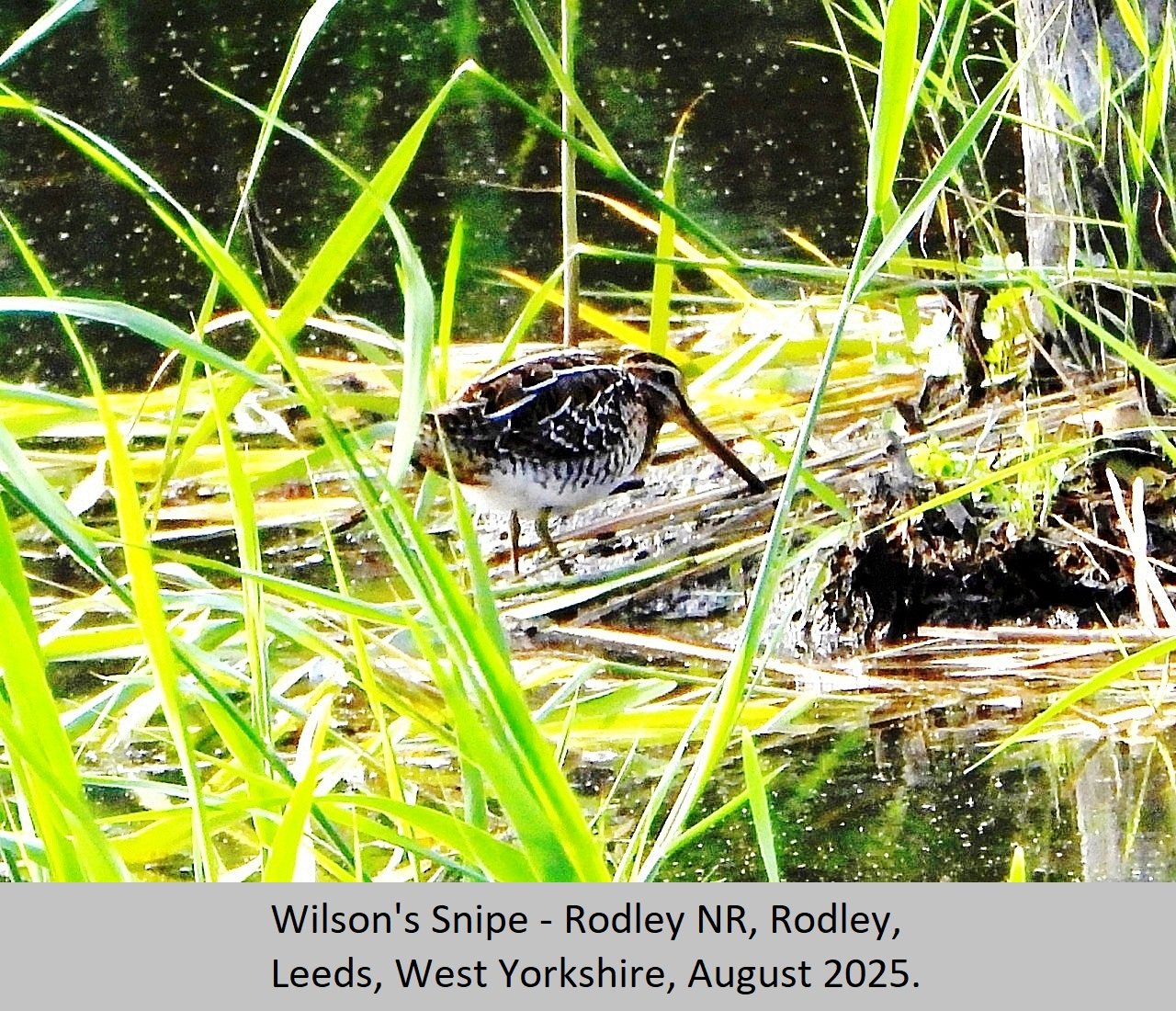 Wilson's Snipe: UK Status: A rare vagrant to the UK, there are very few records, mostly from the Scilly Isles. The one pictured was seen four to five days after storm Erin came over the Atlantic in late August 2025, and battered the Welsh coast, at about the time when they would have been starting their southerly migration. Habitat: This wader inhabits damp, marshy and sheltered wetlands. It's natural range is in Canada and the north of the United States of America. It migrates to overwinter in the south of the USA, northern parts of South America and the Caribbean. Breeding: Wilson's Snipe nest on the ground, usually in well concealed locations. Nests are a shallow scrapes in soft ground, and are lined with local vegetation, including grass and reeds. Eggs are of an olive brown colour splotched with darker purple, black or brown marks. There are between two to four eggs per clutch, very similar in appearance to those of the Common Snipe, and they take about three weeks to hatch. Comment: This species was thought to be a sub species of the Common Snipe, but in 2003 was declared a species in it's own right. There are subtle differences between the two species of bird. The white outline around the wing edges is narrower, brighter, and more well pronounced in the Wilson's. The broad stripe along the back is narrower. Wilson's has sixteen tail feathers, compared to fourteen tail feathers on a Common Snipe. There are also subtle differences to the primary feathers, on the undersides of the wing.