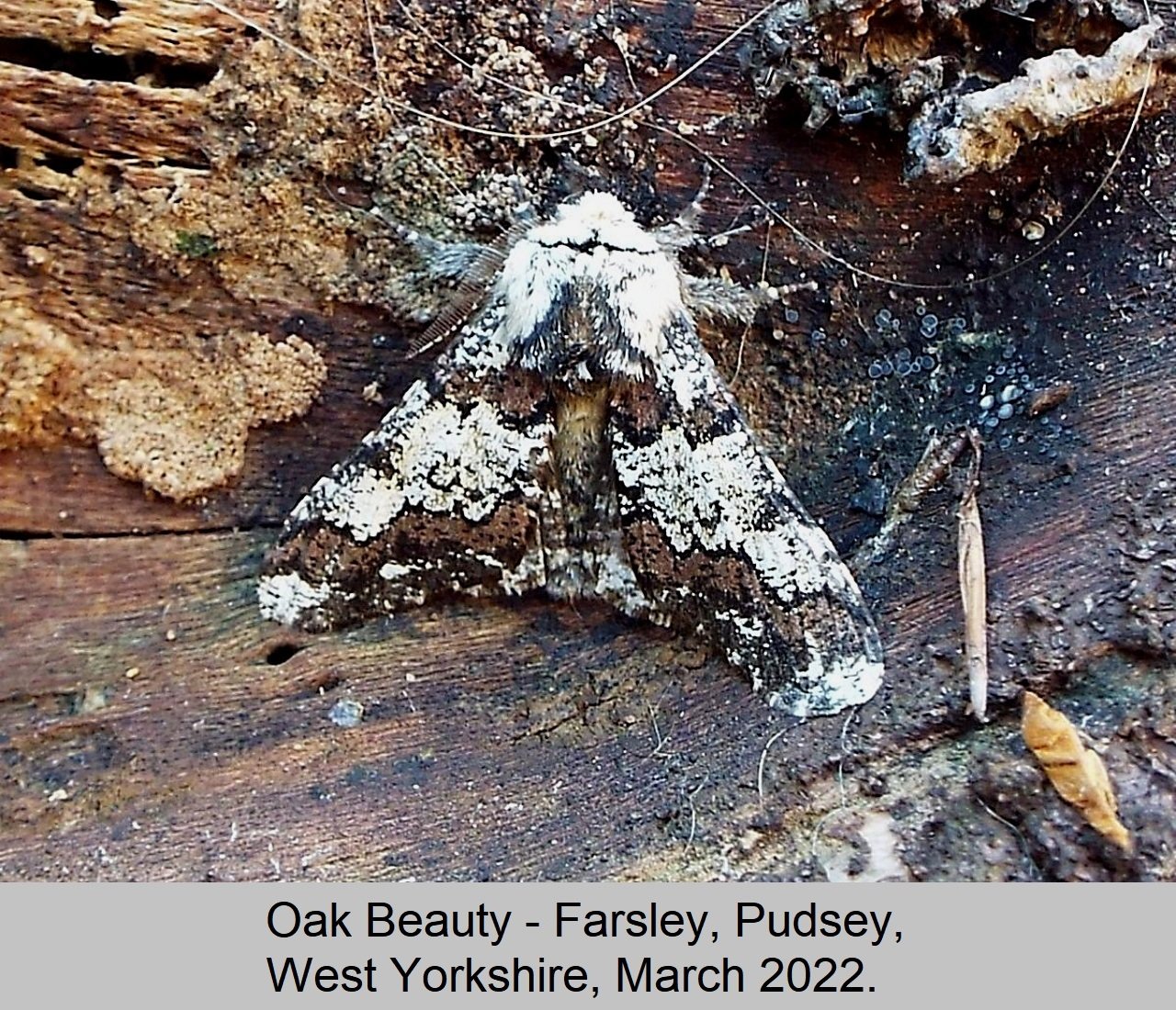 Status: Resident in UK. Wing Span: 40mm to 50mm. Flight Period: March and April. Habitat: Found in a wide range of places where there are reasonable numbers of mature tree's. Comment: Moths are well distributed, and not uncommon in England and Wales. It tends to be less common in Scotland and Ireland. |