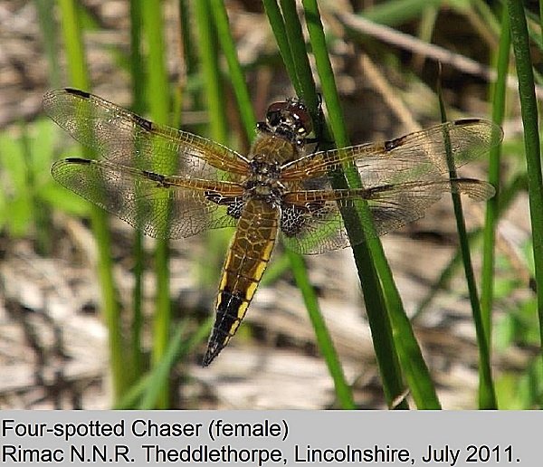 UK Status: Resident Distribution: This dragonfly is common throughout much of Britain, and is still increasing it's range.. Body Length: 38 to 48mm Wing Span: 47 to 59mm Habitat: This species favours the edges of well vegetated shallow ponds and lakes, with some more open area's. Flight Period: From late April through to September. Larval Period: The life cycle from egg two mature adult is two years. Food Source: Most smaller insects and invertebrates. Similar Species: The identifying feature of this species is the four distinct spots, one on each of the leading edge of the wings. |