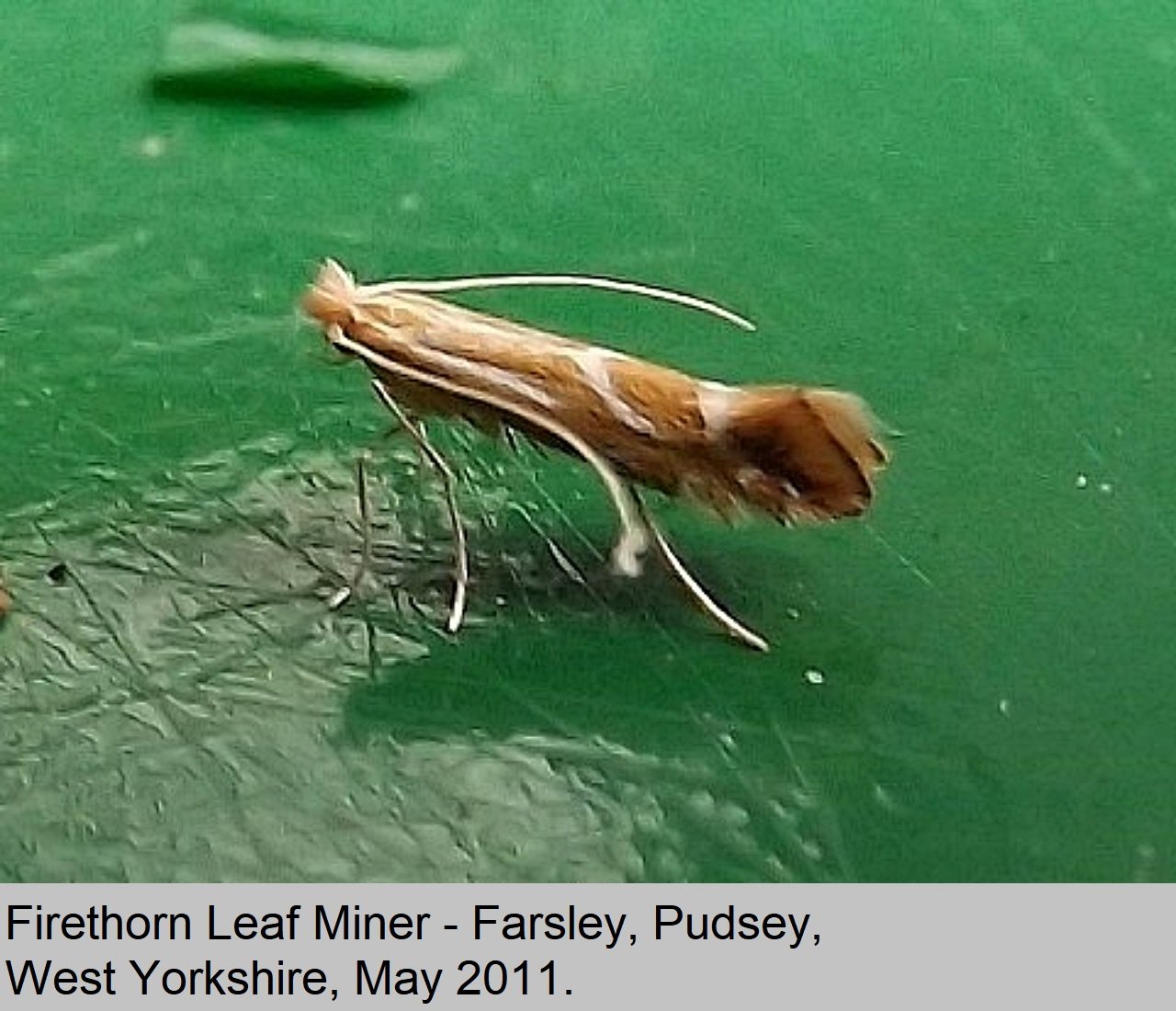 Status: Resident in UK. Wing Span: 7mm to 9mm. Flight Period: Several overlapping broods, flying from April until October. Habitat: Found in Parks and Gardens where Pyracantha is present. Comment: Fairly common in England and Wales, as far north as Yorkshire. |