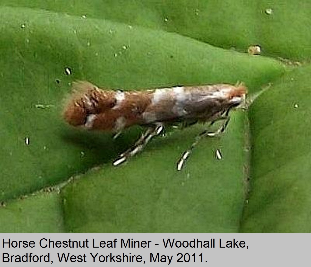 Status: Resident in UK, since 2002. Wing Span: 7mm to 9mm. Flight Period: spring through to Autumn, in overlapping broods. Habitat: Found any where with Horse Chestnut trees. Comment: Fairly common as far north as Yorkshire. |