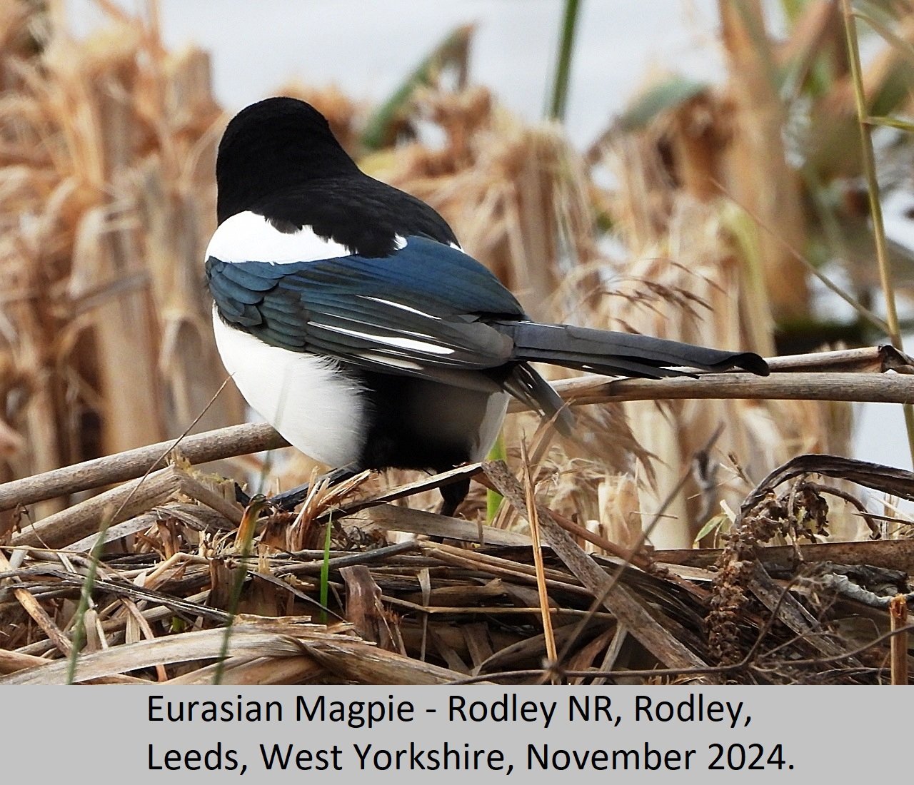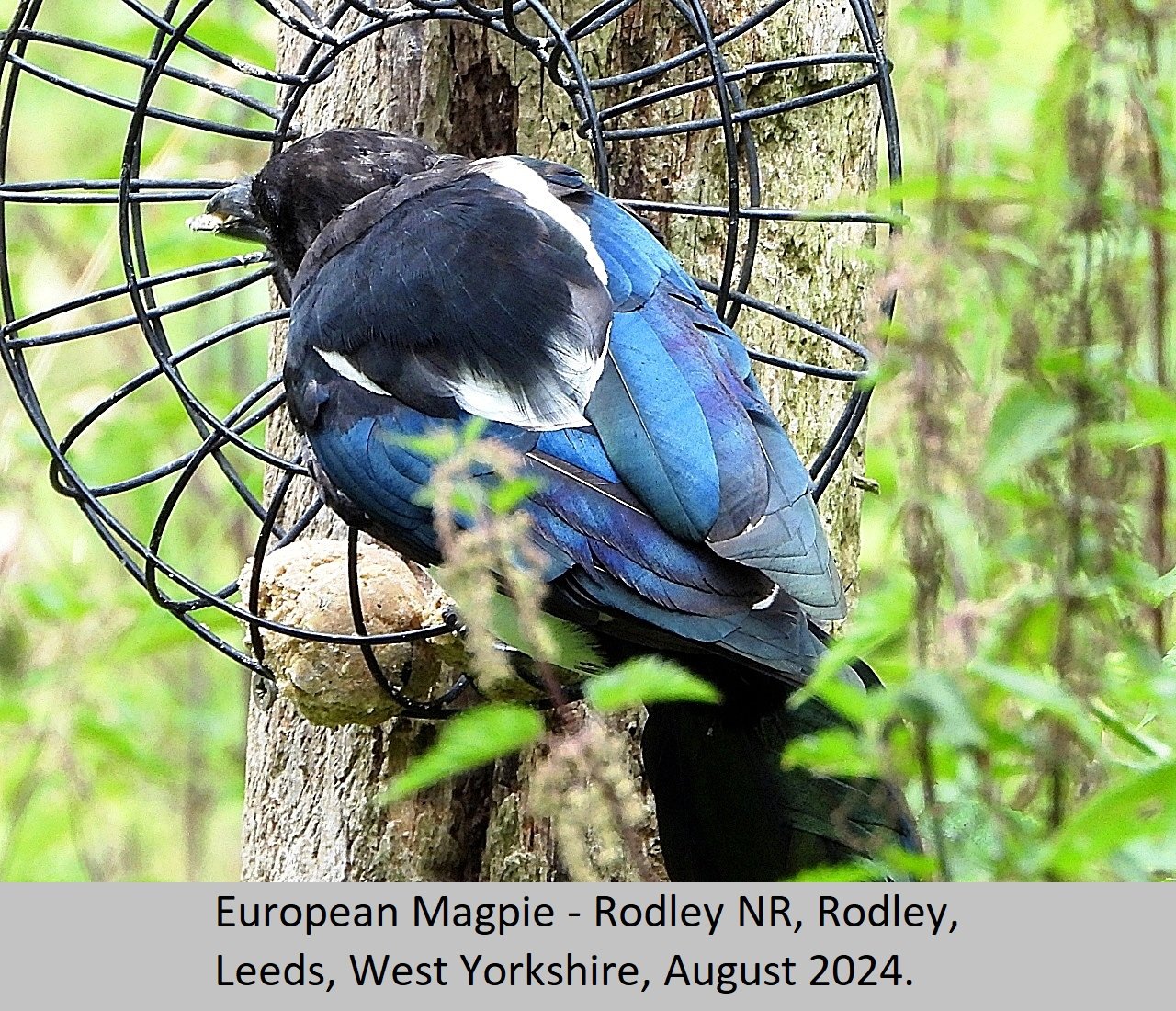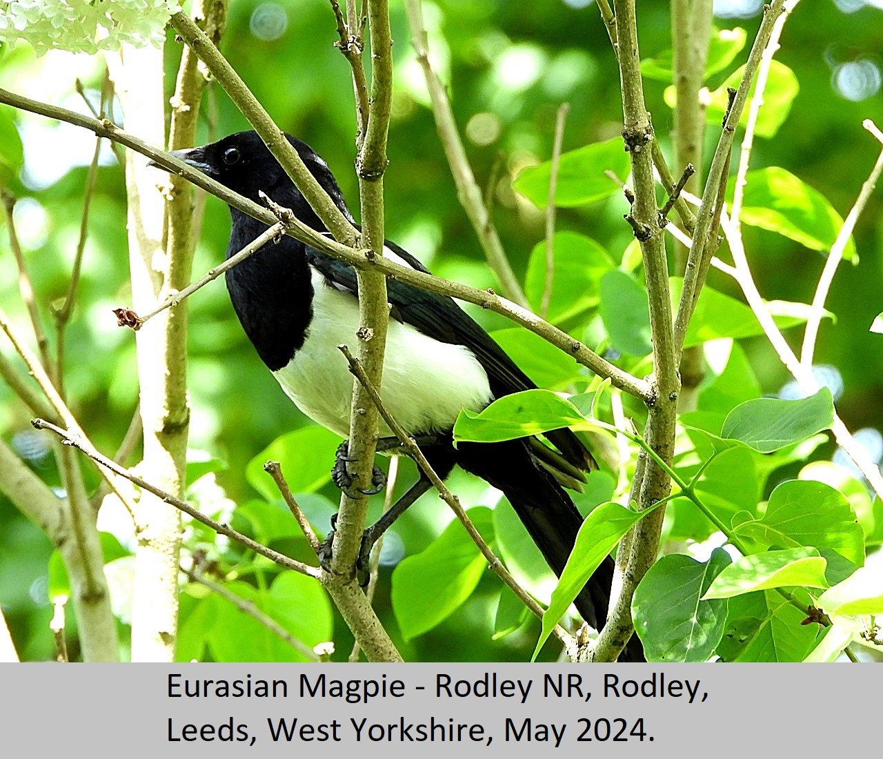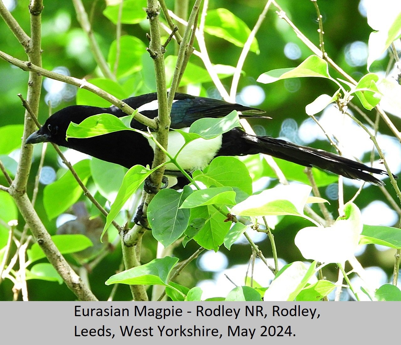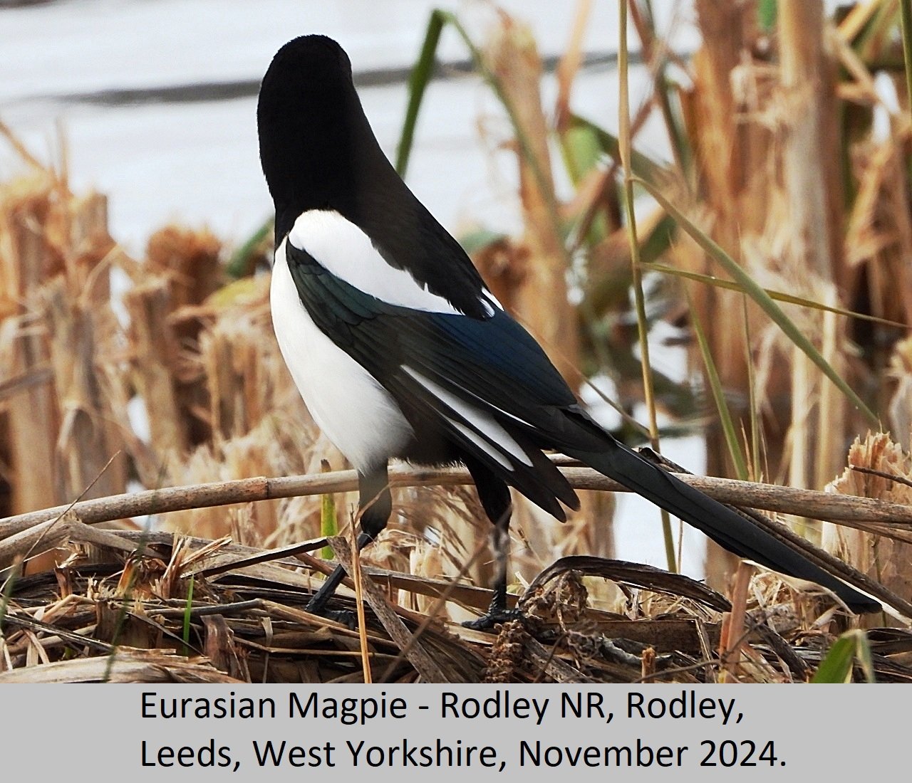 Eurasian Magpie: UK Status: Resident. Habitat: This is found is found in many habitat types including, gardens, parks, tall hedgerows, woods and heaths. Breeding: This bird seems to require fairly tall dense thorny, or prickly shrubs to nest in. They build a nest of sticks and twigs, with a domed roof over the top. There is an entrance hole on one side of the nest, Eggs number five to eight per clutch, and are pale blue heavily streaked and mottled with darker brown. Comment: This beautiful largish black and white bird, with it's bluish purple iridescent sheen is fairly common throughout the British Isles. |
