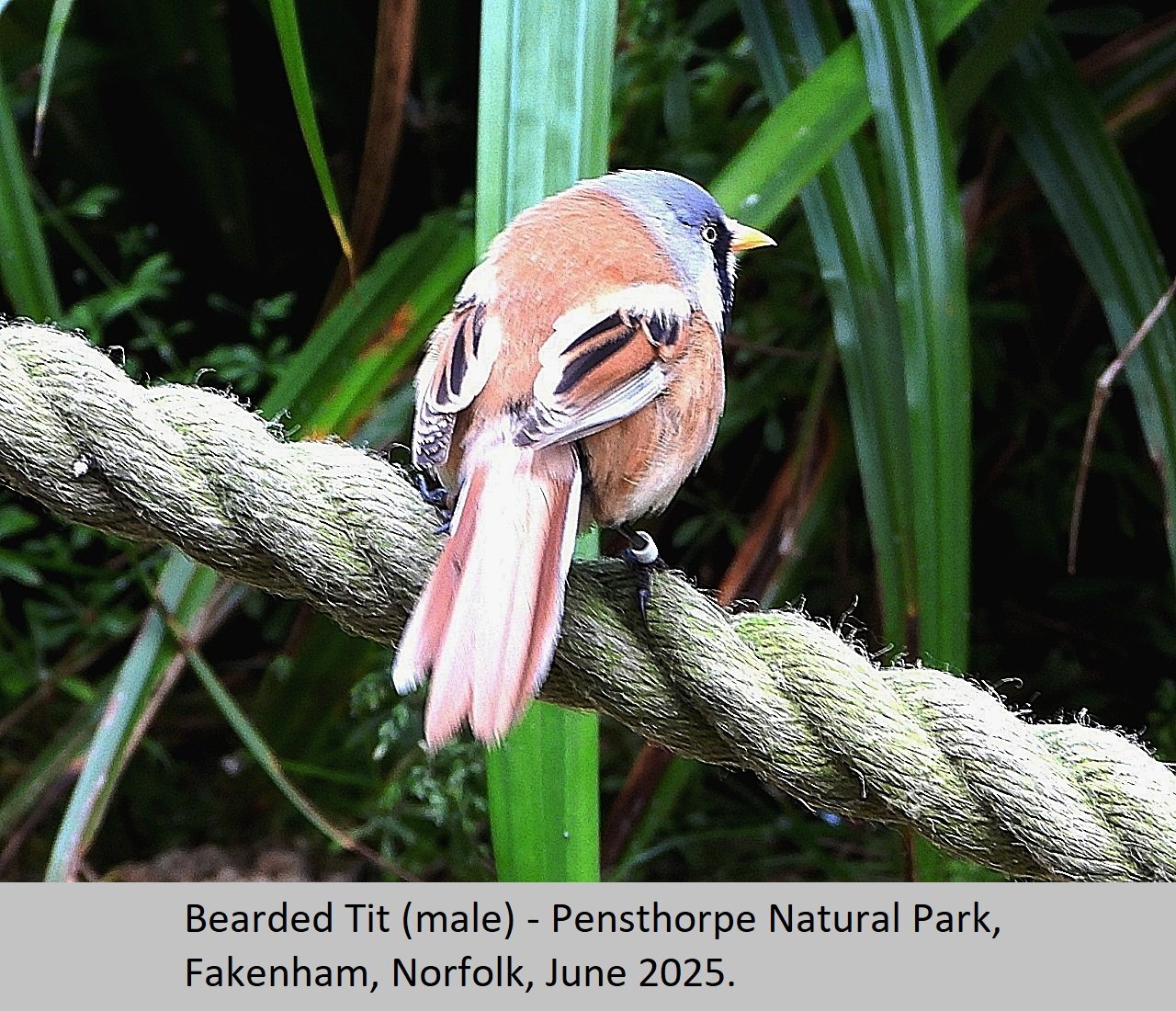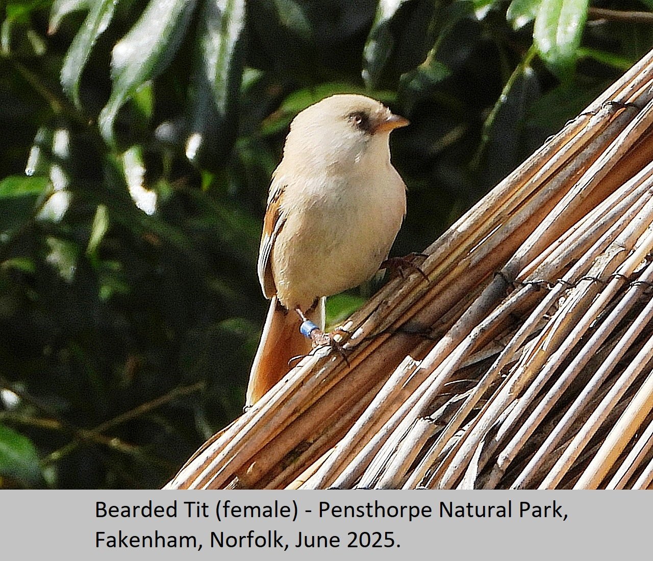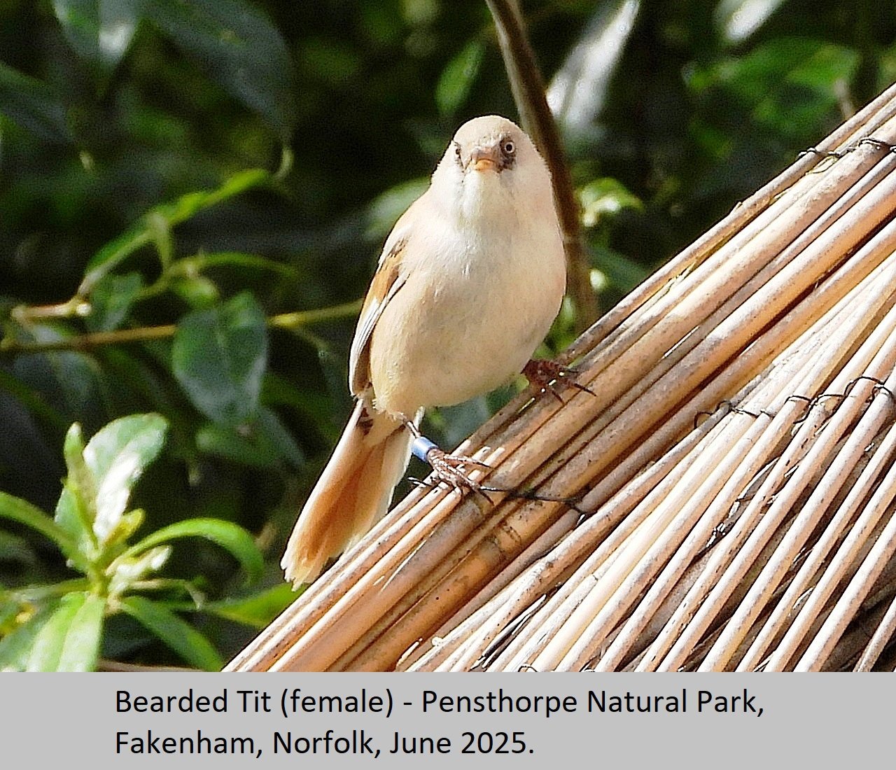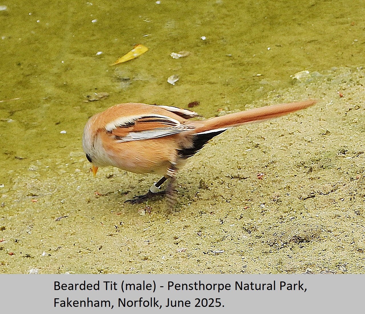 Bearded Reedling: UK Status: Resident, with about seven hundred breeding pairs in the UK. More can be seen in spring and autumn when some birds from Europe are migrating. Habitat: This bird inhabits extensive and mainly coastal reed beds during the breeding season, around the waters edge, as part of it's name suggests. Sometimes a few birds are spotted elsewhere during the late autumn, through to early spring. Breeding: Nests are placed well inside reed beds, quite low down and are interwoven with the reeds as support. They are constructed from reeds for the outer shell, the cup inside is lined with dry grasses. The normally lay four eggs, which are of an olive brown, with blackish brown blotches and squiggles, mainly toward the broader end. Comment: The Bearded Reedling is also known as the Bearded Tit, the male and female birds are sexually dimorphic, as you can see. They are not particularly common, at least partly due to the loss of wetlands over the last few decades. Most observers only get fleeting glimpses of these birds. They deep within the reed bed, perching on top of the reeds for mere seconds at time. They are a devil to photograph, as my pictures will confirm.