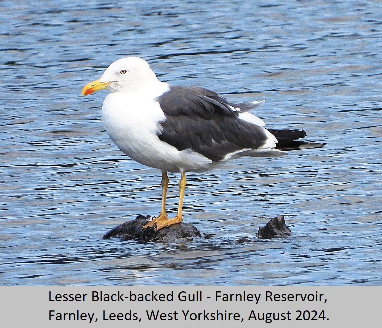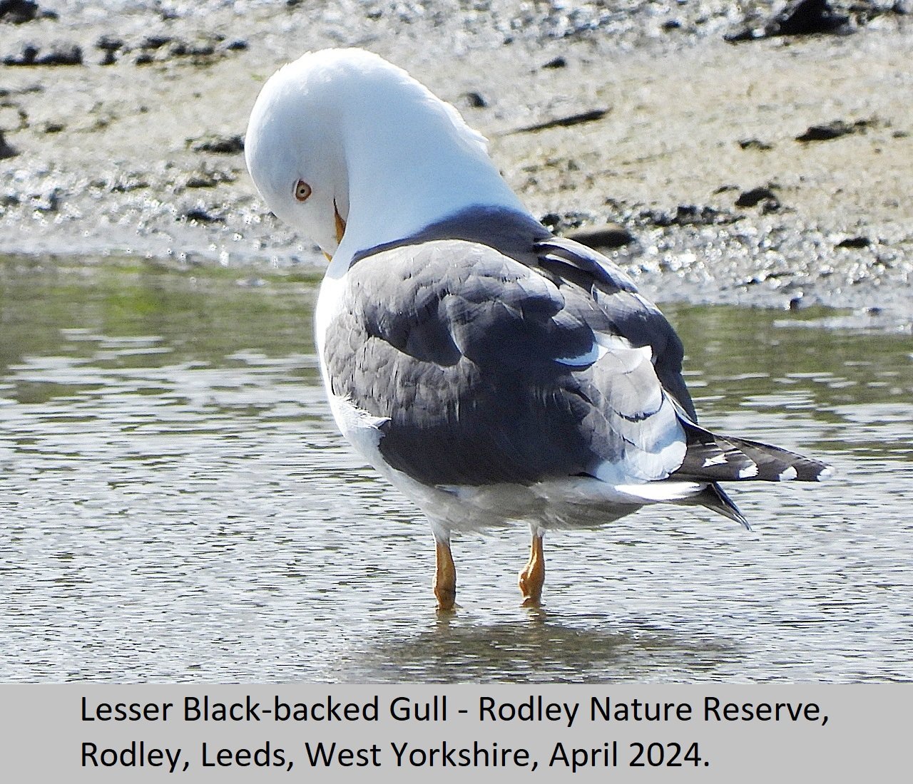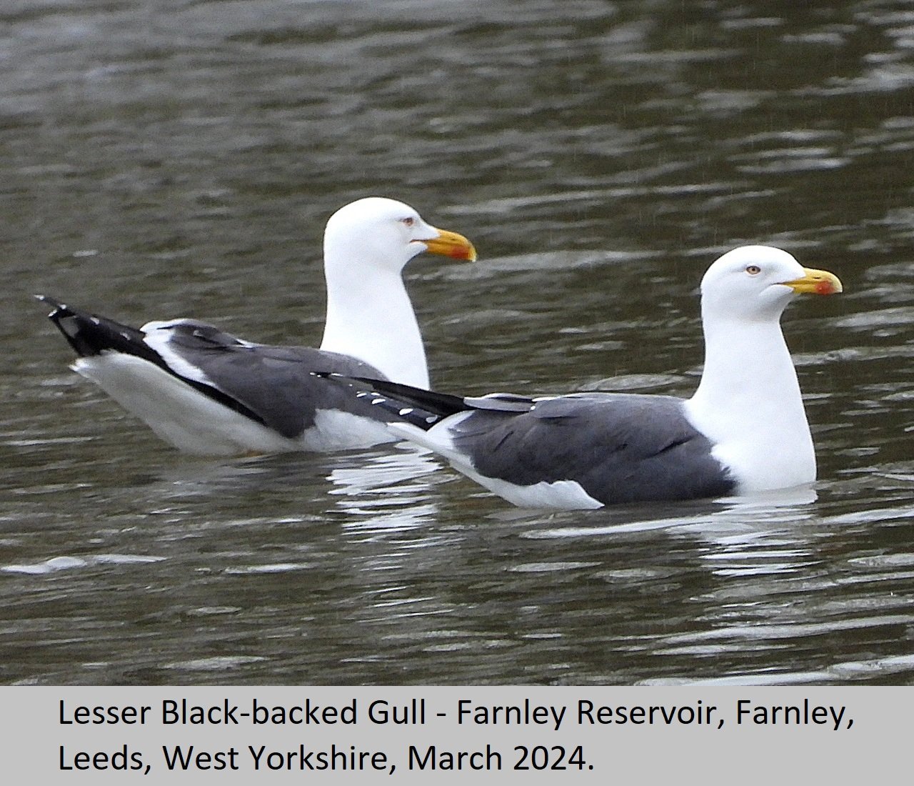 and grey markings, there is only one brood a year. Comment: Not a common gull any more, it's numbers have been declining over the last few decades. It's survival as a British species is of concern. Lesser Black-backed Gulls look very similar to it's larger cousin the Greater Black-backed Gull, the largest gull in the world. Lesser Black-backed have yellowish legs, Greater Black-backed have pinkish legs, and are larger birds. This bird is very much like the Yellow-legged Gull, the wing coverts are darker though, and the Yellow-legged is a slightly larger bird. Greater Black-backed Gulls have pink legs, and are larger and bulkier in appearance. Their colour is darker charcoal, or black, the white mirrors on the wing tips are larger. Lesser Black-backed Gulls have yellow legs, a slimmer and smaller appearance, and are not as dark in colour, being slate grey. They also have smaller white mirrors on the wing tips. |